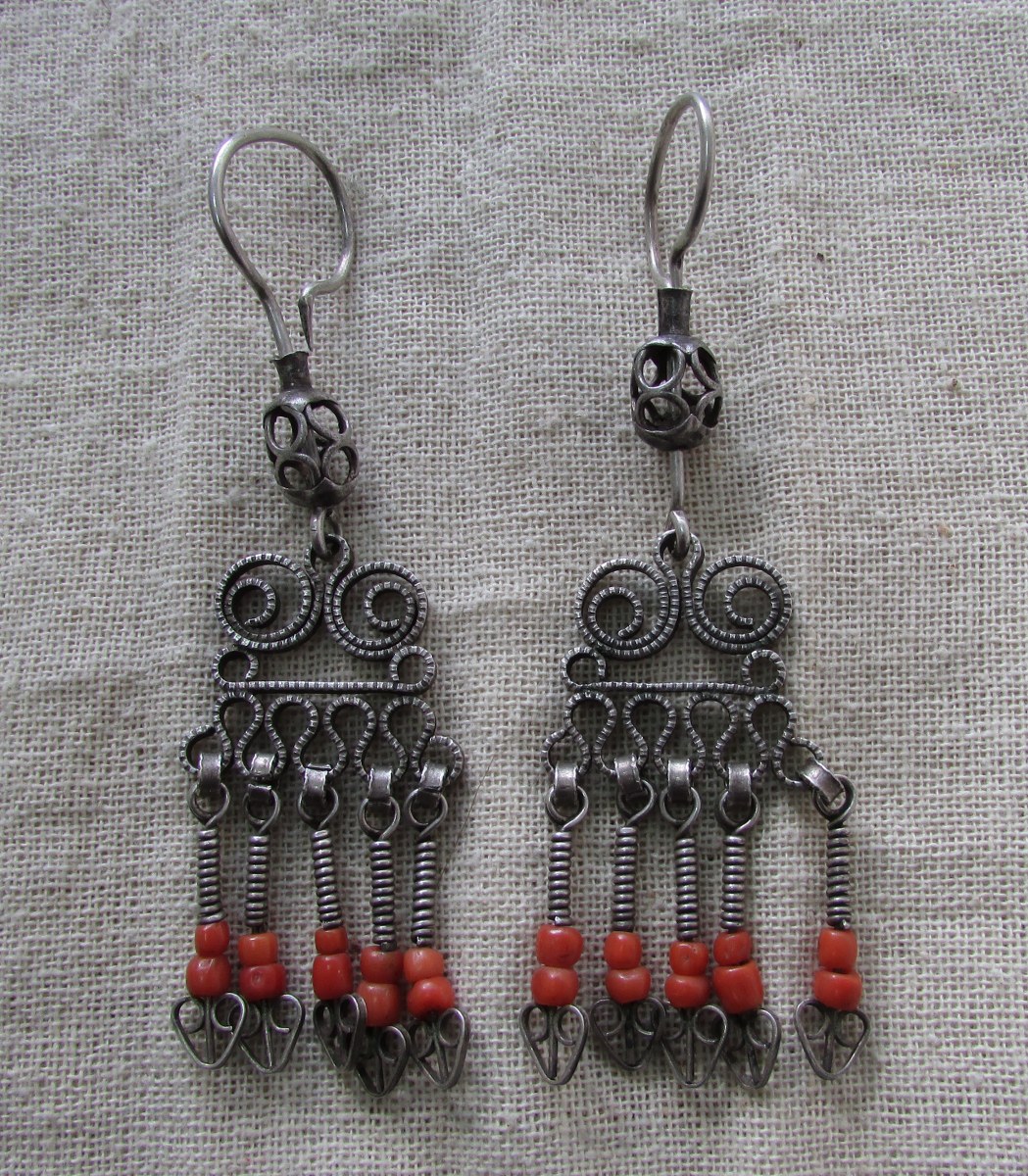 Изготовлены из металла белого цвета, сложной конструкции, использованы вставки из коралла. Состоят из дужки круглой формы и основной ажурной части. Основная часть изготовлена из металлической пластины с насечками. Верхняя часть скручена в виде орнамента «кошкар муйиз». Снизу припаяна плоская пластина с закругленными кверху краями. Книзу этой пластины припаяна зигзагообразная пластина. От него свисают пять скрученных проволок с нанизанными на них бусинами коралла (по 2 шт). Концы в виде ажурных сердечек. К верхней части основной конструкции петелькой прикреплена белая металлическая проволока, другой конец которой скручен в виде круга, образуя дужку серьги. Между дужкой и основной конструкцией подвижная ажурная конструкция овальной формы, которая служит застежкой.