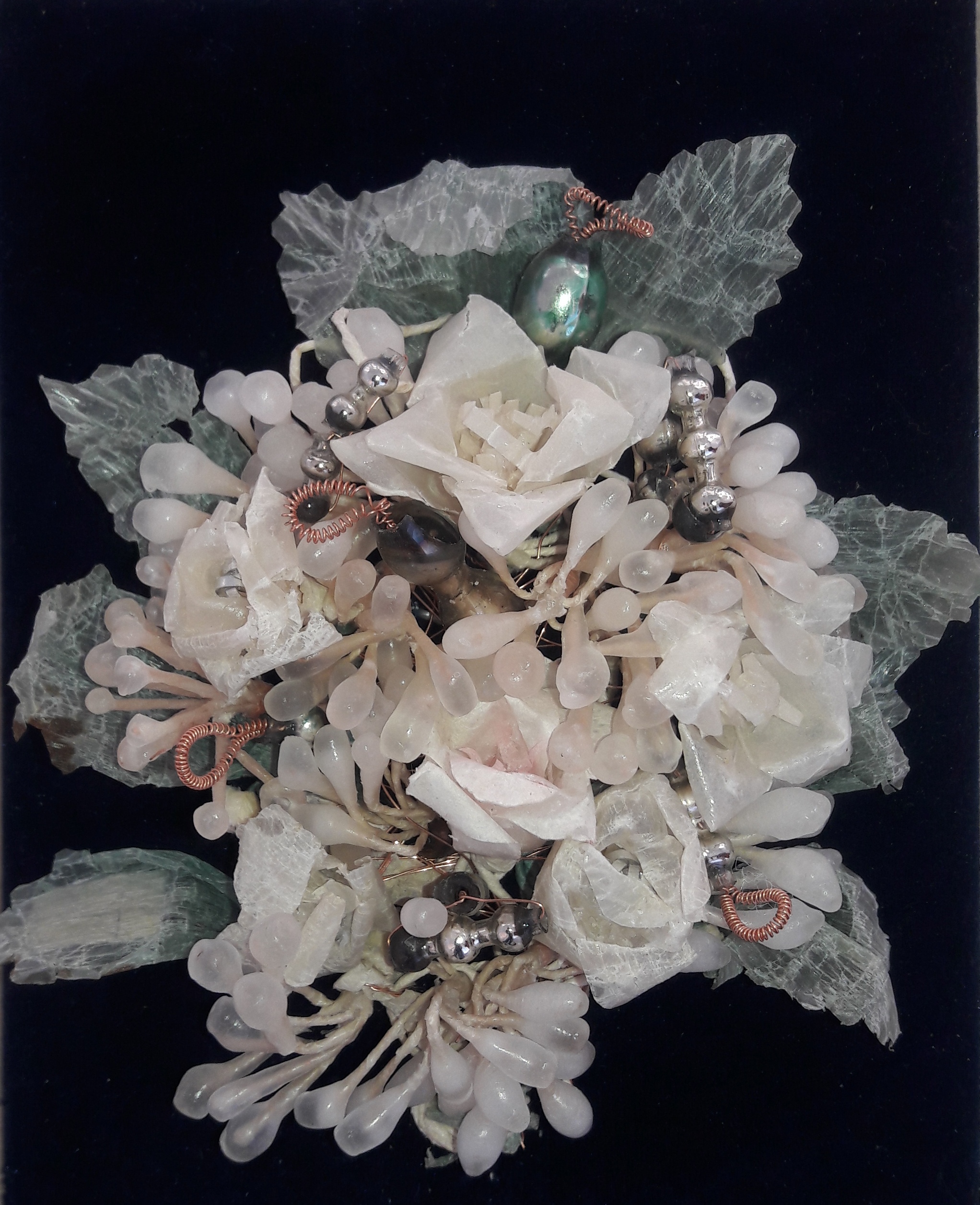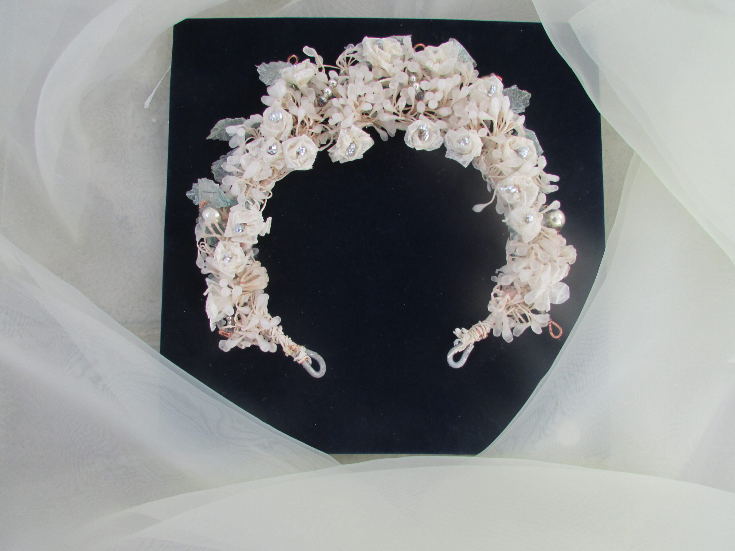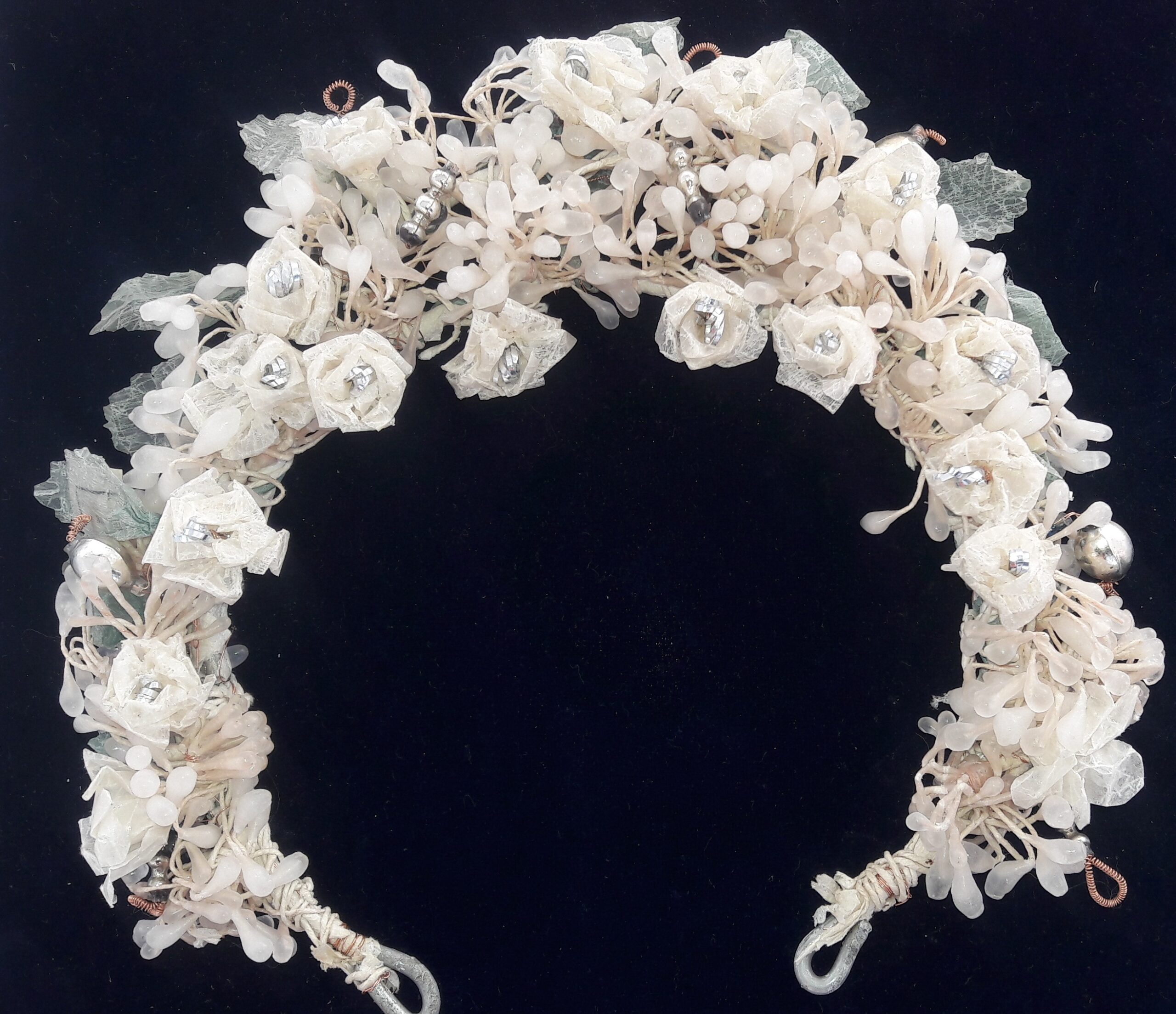 Сделан венок из маленьких восковых шишечек-зернышек, которые наращивались на стебель из проволоки. Шишечки собирались в соцветия, которые вместе с листьями навивались на основу венца. Венок также украшен небольшими цветами из бумаги. Свадебный венок бережно хранили всю жизнь, никому не отдавали. В старину существовали поверья, что если отдаешь венок кому-то, то «счастье свое потеряешь». Также бережно хранились и восковые веточки, которые во время свадьбы крепили на грудь жениху и невесте, а также  венчальные свечи.