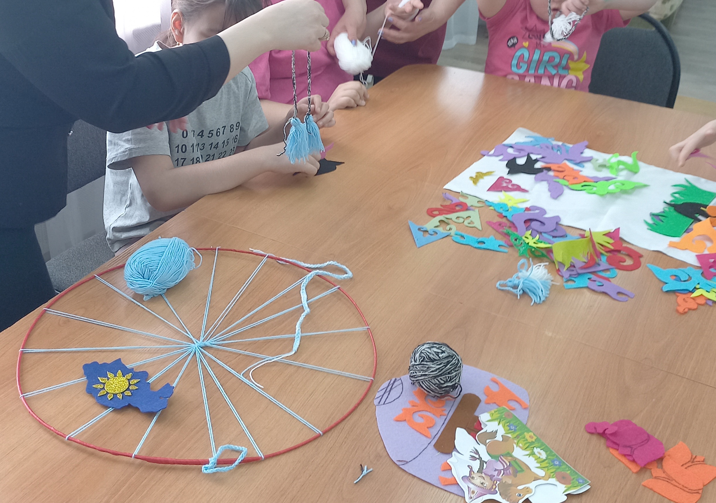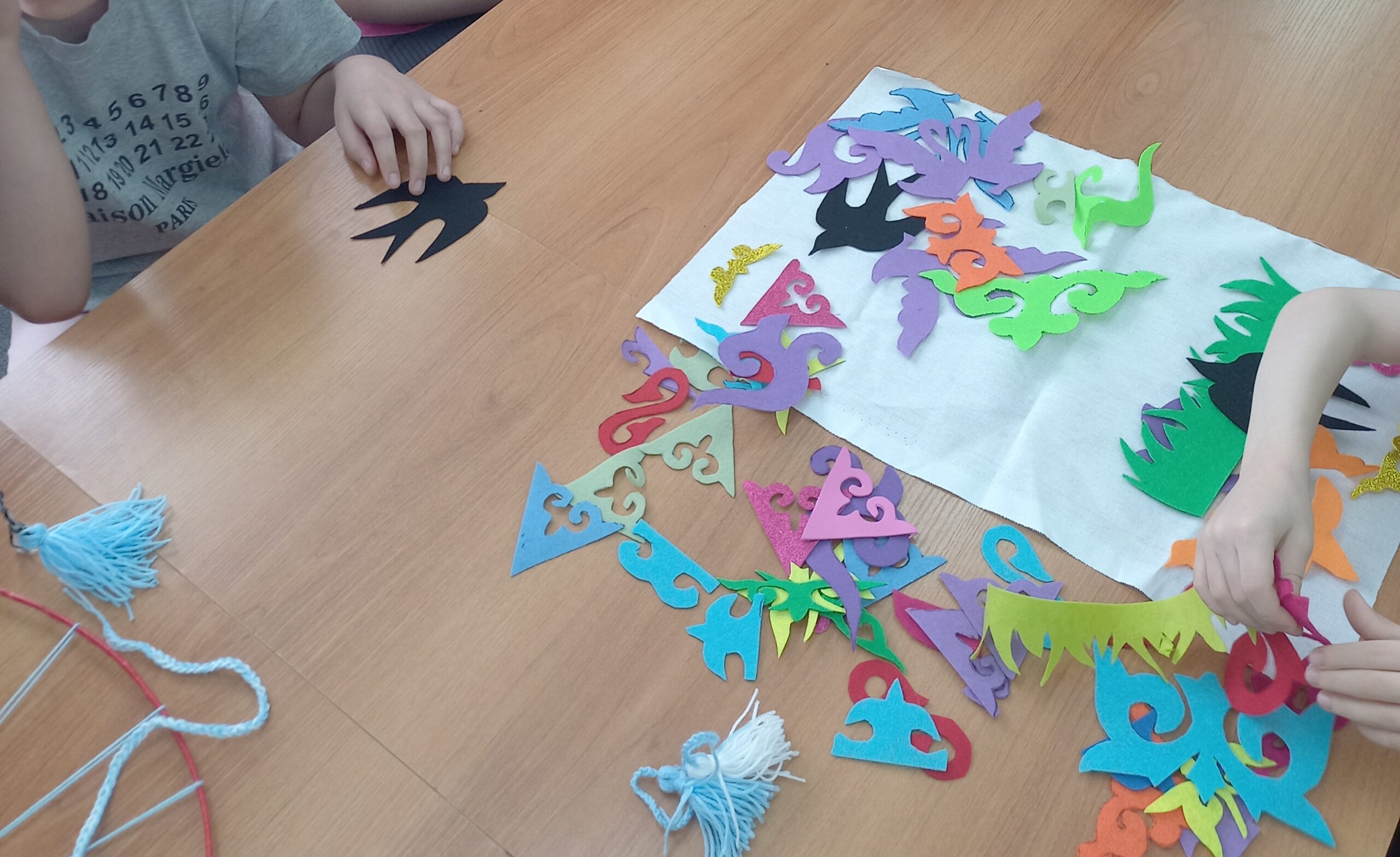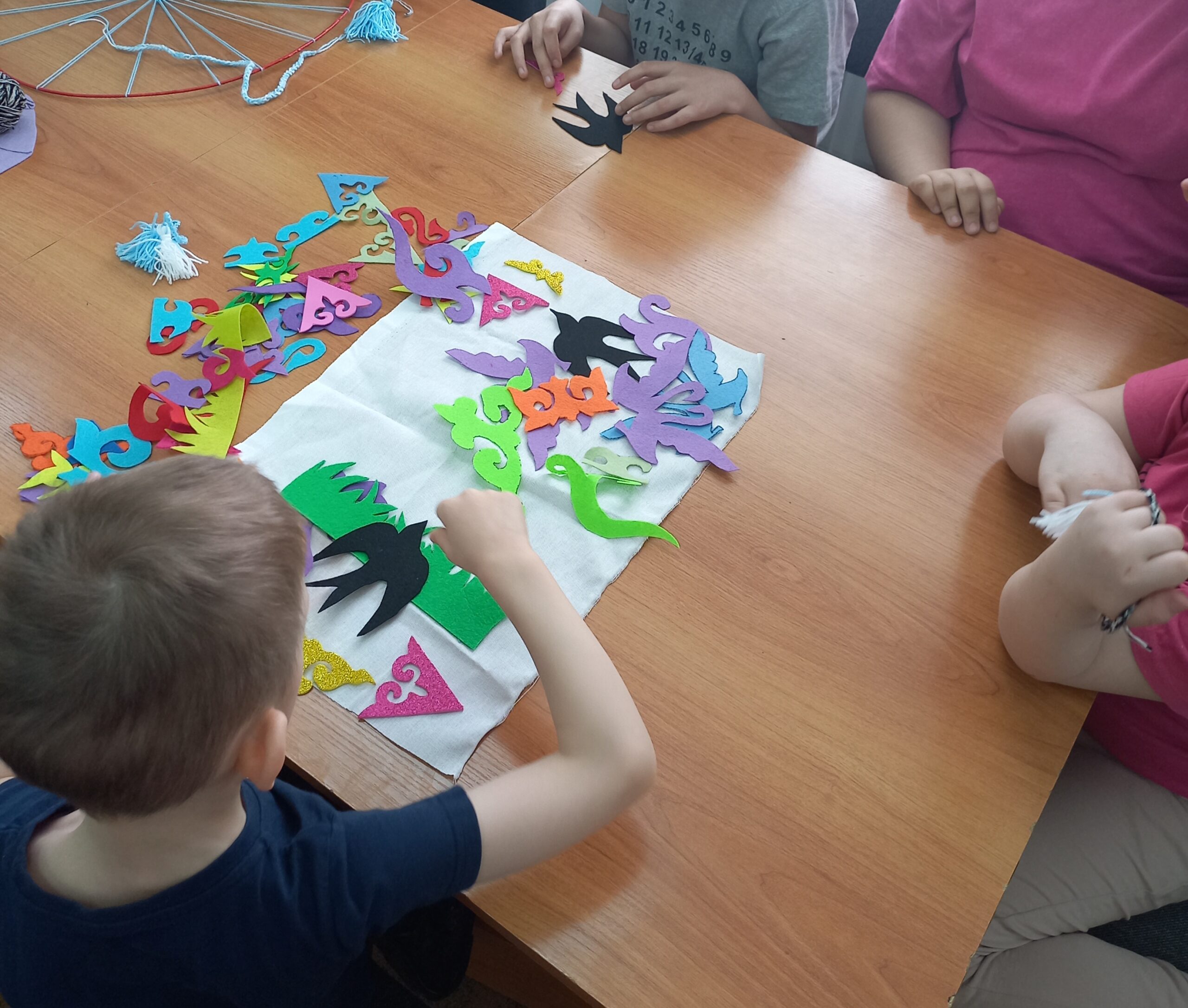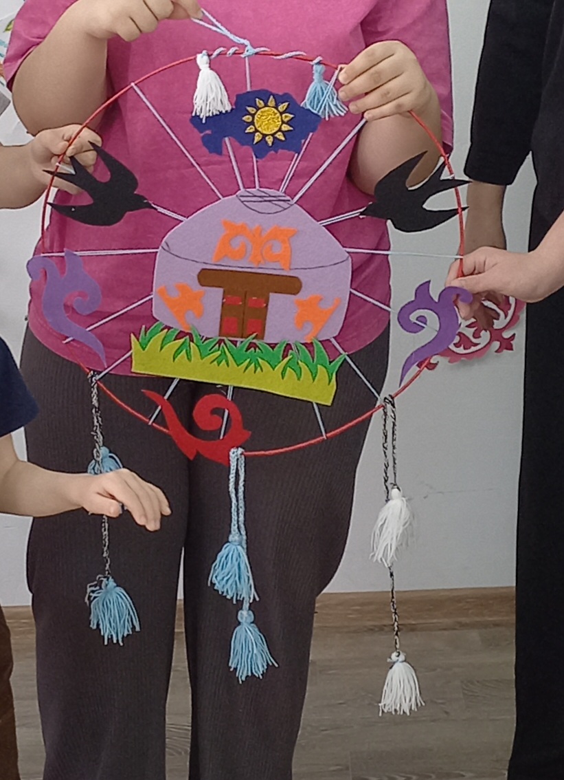 Особое внимание было уделено искусству создания традиционных этнических предметов, что вдохновило участников на творчество. Итогом занятия стало изготовление этнокруга и ковра в технике аппликации. Ребята с увлечением трудились над своими изделиями, выражая через них свою любовь и уважение к казахской культуре.