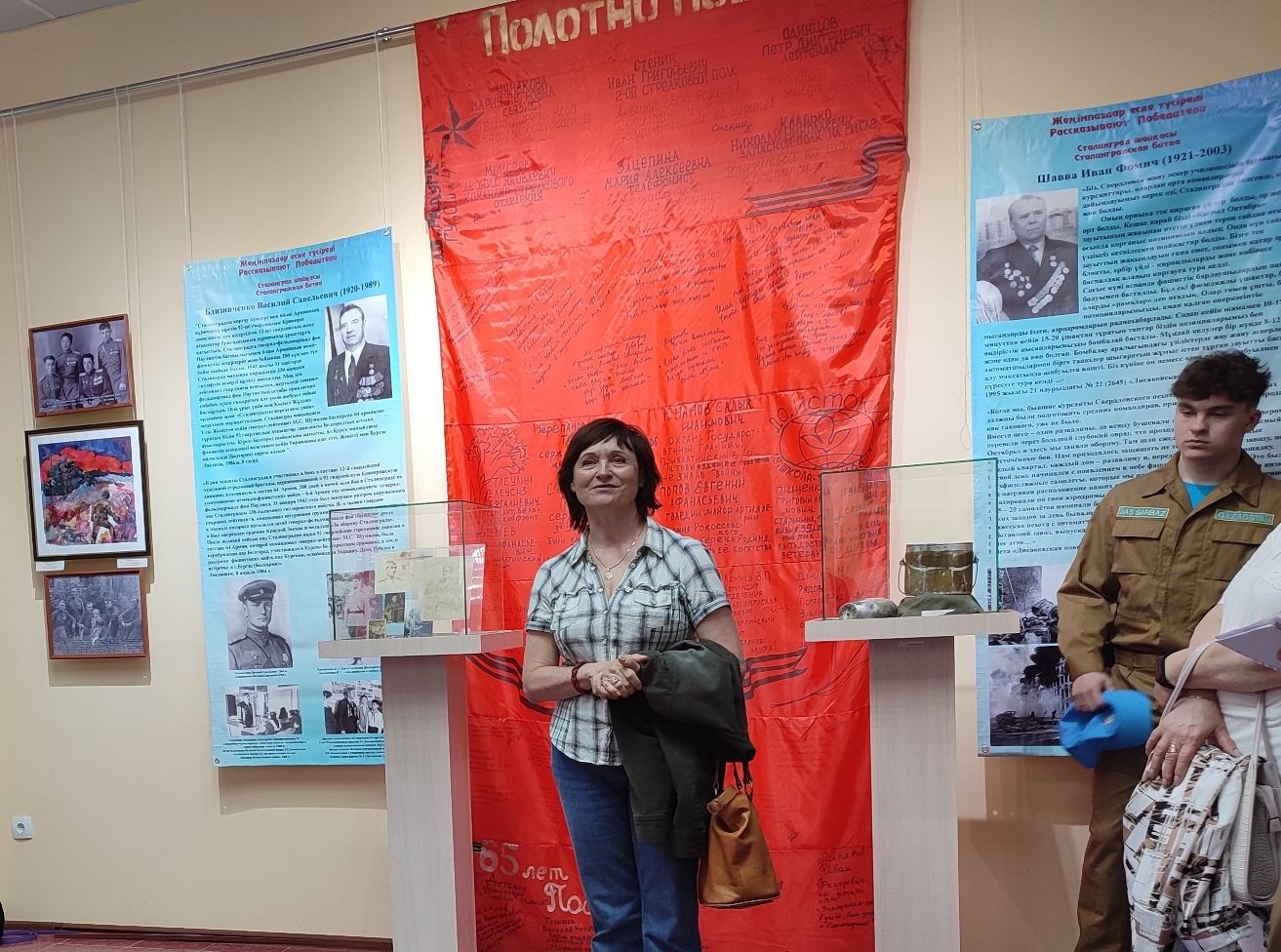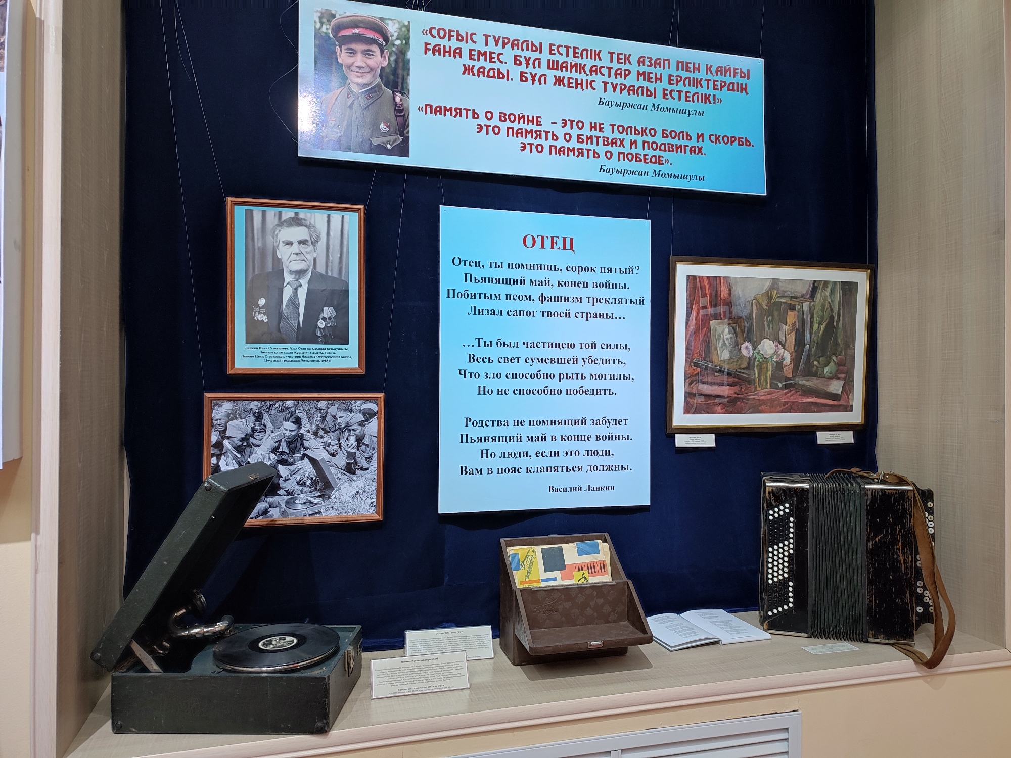 Главный объект внимания на выставке — фрагменты воспоминаний одиннадцати участников Великой Отечественной войны: В.С.Близниченко, С.Ержанова, М.Ж.Жандарбекова, Н.И.Жаркова, К.Канафина, В.С. Кузнякова, В.Д.Михайловского, К.Раисова, Г.Р.Суржко, И.Ф.Шаввы, Д.А.Шарыгина. Это почетные граждане Лисаковска, первостроители, те, кто жил и работал в Лисаковске. На открытии выставки присутствовали К.М.Кадырова (Жандарбекова), К.К.Шутаева (Канафина), В.И.Чуменко (Шавва) – дочери ветеранов, которые поделились рассказами о своих отцах.