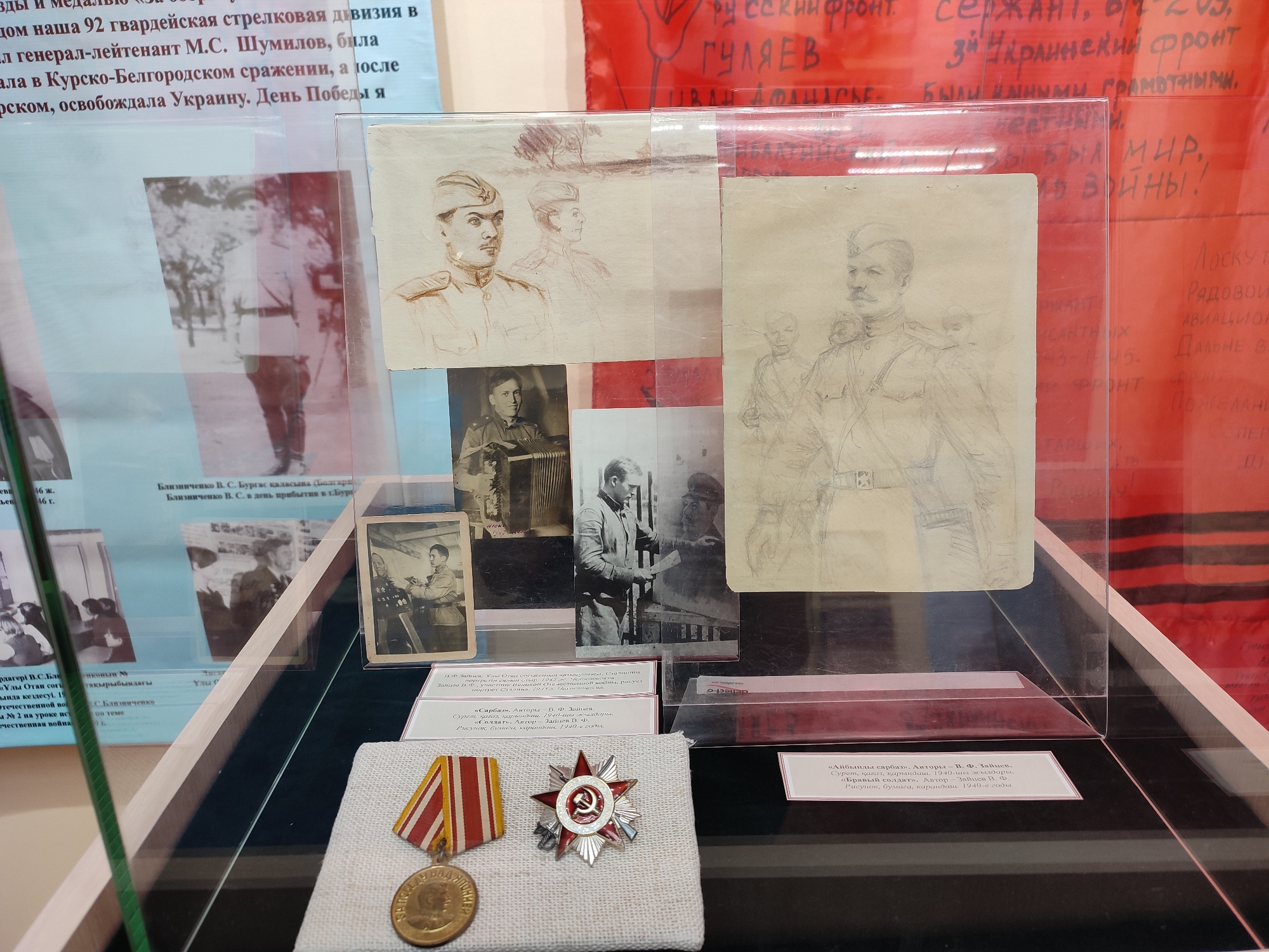 Подлинным художественным свидетельством о войне являются сегодня послевоенные наброски участника Великой Отечественной войны, талантливого лисаковского художника – В.Ф.Зайцева. Воспоминаниями о нем поделилась на открытии директор Лисаковской художественной школы С.В.Карженкова. Четыре творческих произведения учащихся Лисаковской Детской художественной школы представили на выставке детский взгляд на военные сражения.