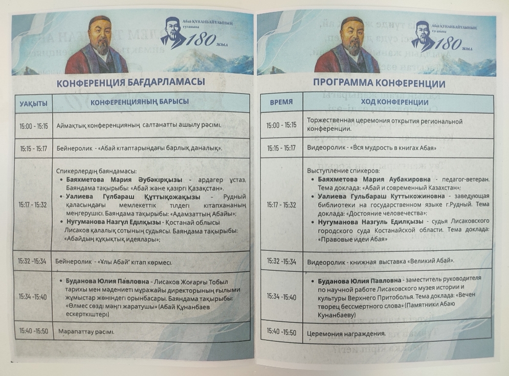 10 октября 2025 года сотрудники Лисаковского музея приняли участие в региональной конференции «Әлем таныған Абай», посвященной 180-летию Абая Кунанбаева. Конференция организована Лисаковской централизованной библиотечной системой.