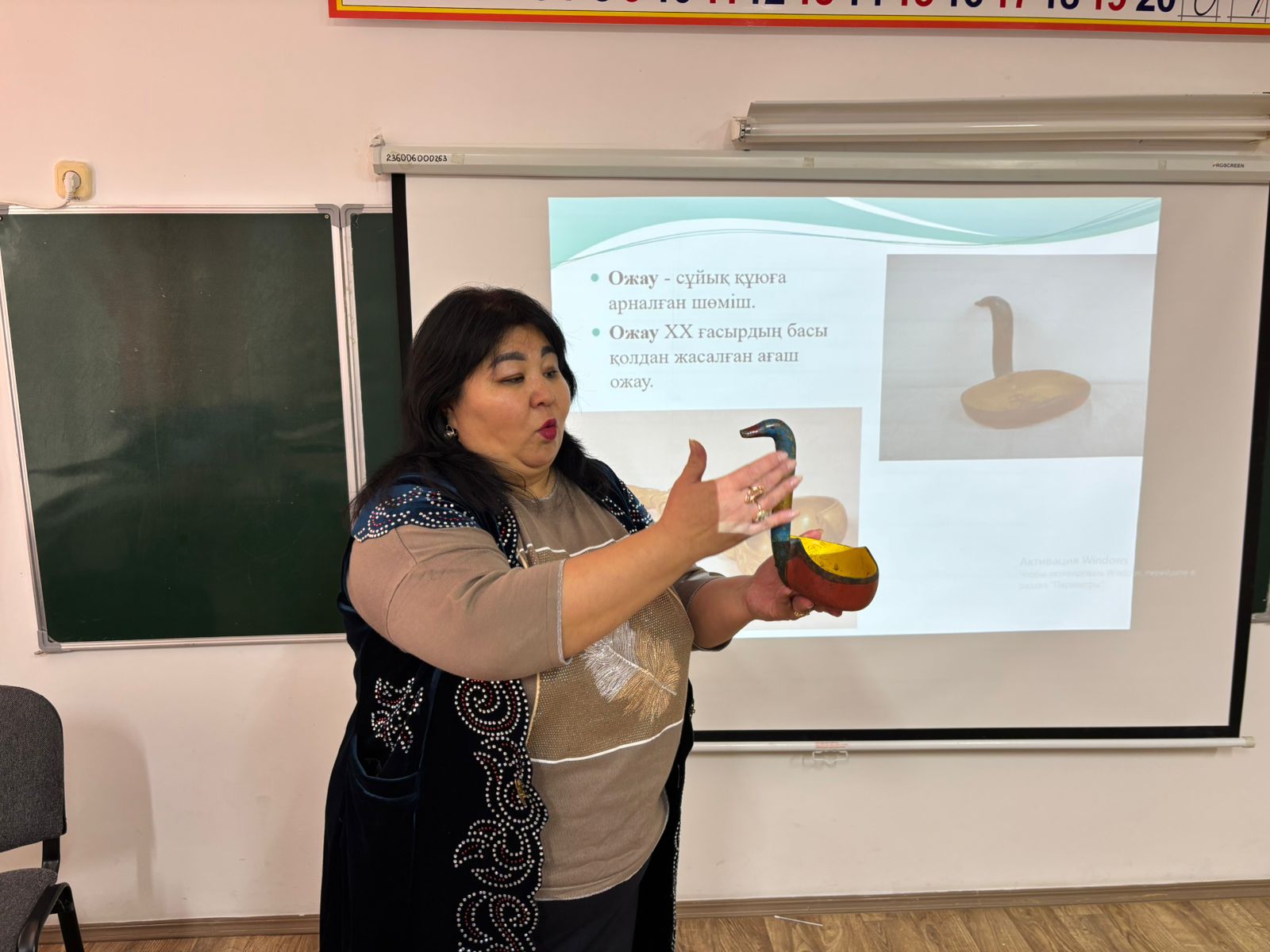 Тема лекции — «Деревянная посуда казахского народа». Учащиеся узнали о дерявянной посуде, о том, как мастера ее изготавливали, для чего использывали деревянную посуду. Школьники познакомились с деревянной посудой, хранящейся в Лисаковском музее. Одним из ярких экспонатов является деревянный ковш – «ожау» ручной работы начала 20 века. Ожау имеет овальную форму, приподнятую ручку в форме головы и шеи лебедя.Занятие провела методист музея А.А.Салпенова. В заключение встречи учащиеся отвечали на вопросы и собирали пазл.