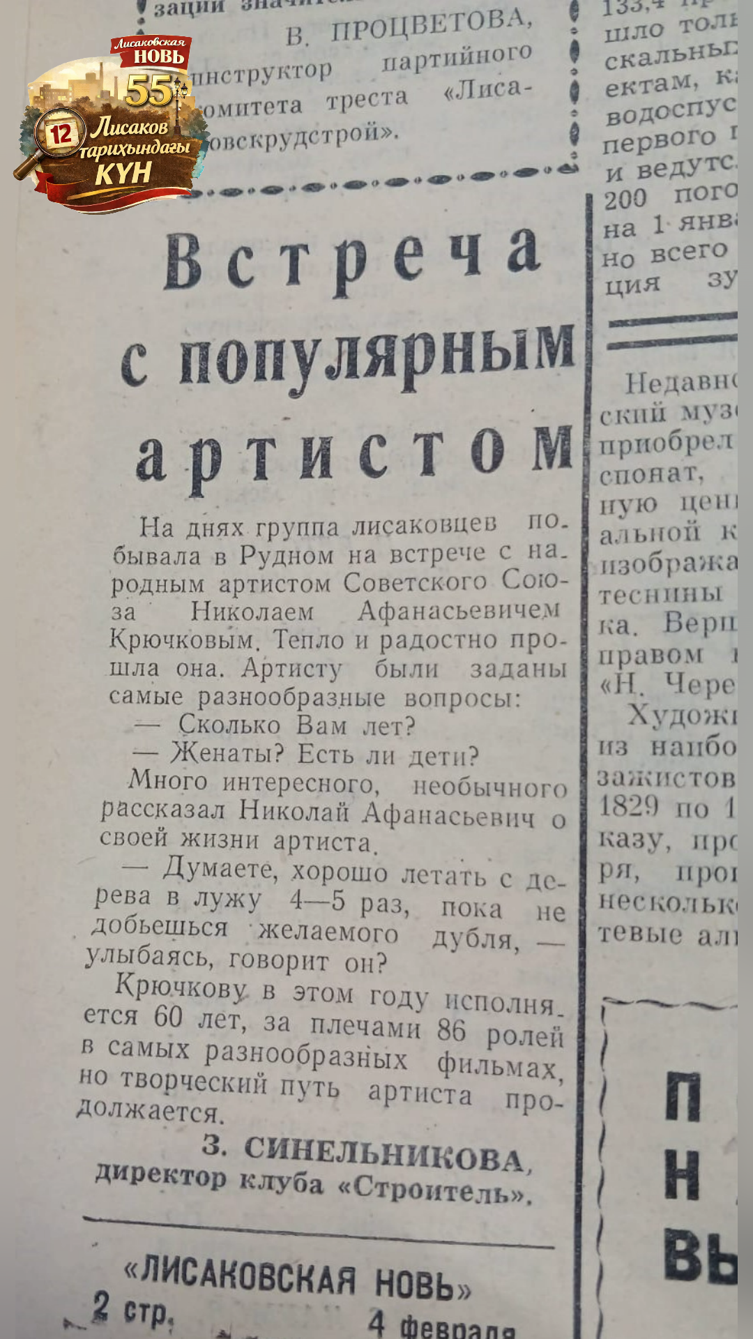 Осы күндері лисаковтықтар маңызды мәдени оқиғаның куәсі болды. Қала тұрғындарының бір тобы Рудный қаласына барып, КСРО-ның халық әртісі Николай Афанасьевич Крючковпен кездесу өткізді.