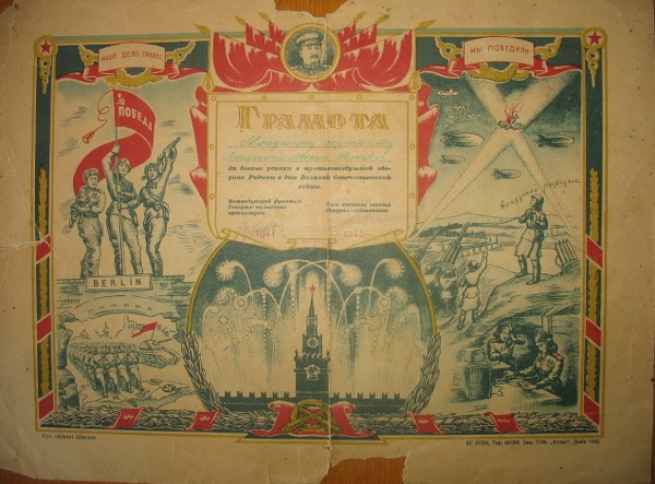 ІІ дәрежелі Отан соғысы орденімен, Жуковтың, «1941-1945 жылдардағы Ұлы Отан соғысында Германияны жеңгені үшін» медальдарымен марапатталған, жоғарғы қолбасшылық грамоталары мен мерейтойлық марапаттарға ие.