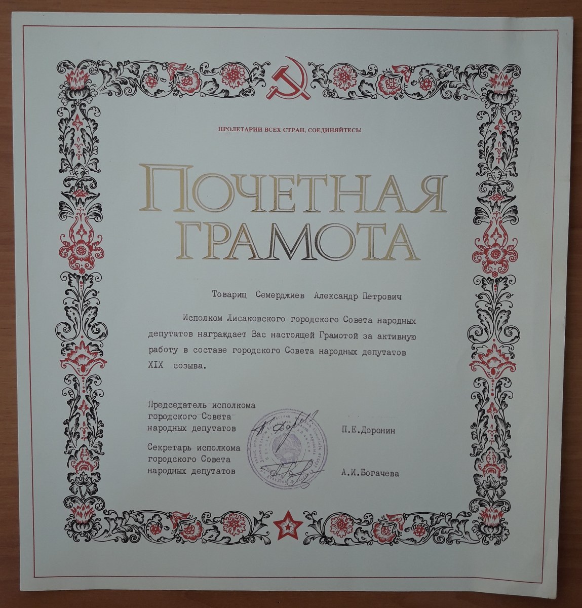 За активную производственную, общественную, политическую работу, доблестный созидательный труд, прославивший Лисаковск и оказавший большое влияние на улучшение благосостояния трудящихся города А. П. Семерджиеву – экскаваторщику рудника Лисаковского горно-обогатительного комбината   было присвоено звание «Почетный гражданин города Лисаковска» (решение Лисаковского горисполкома № 331 от 30 ноября 1982 года).