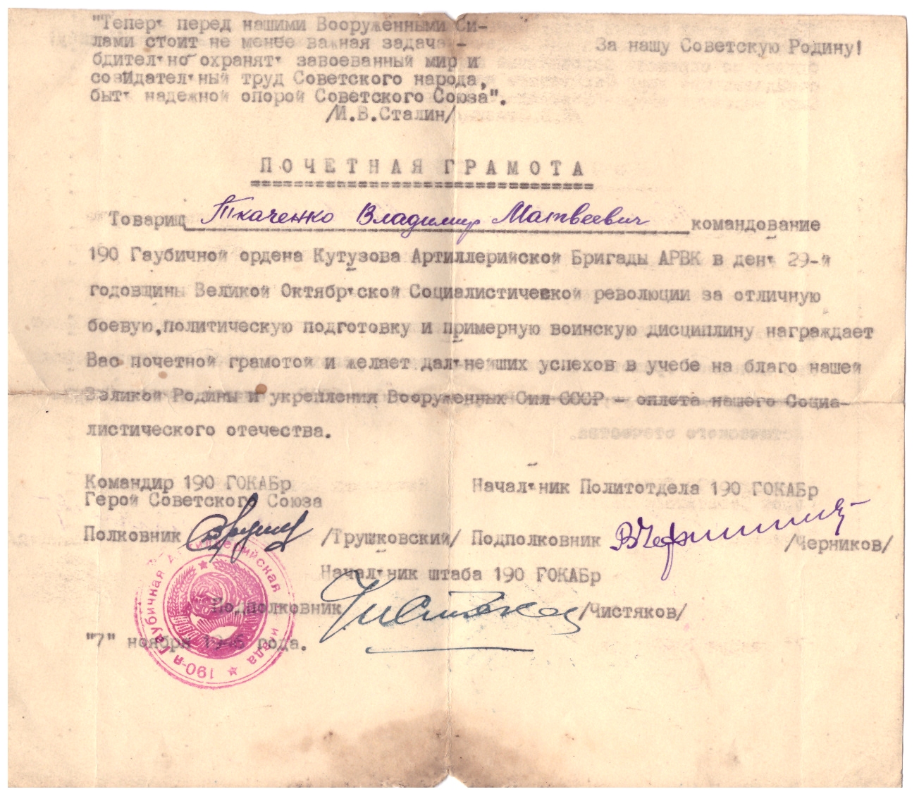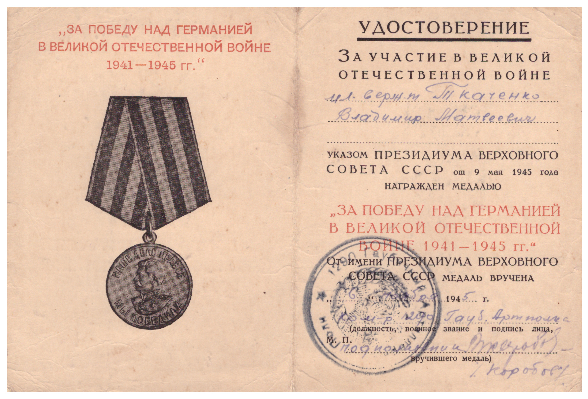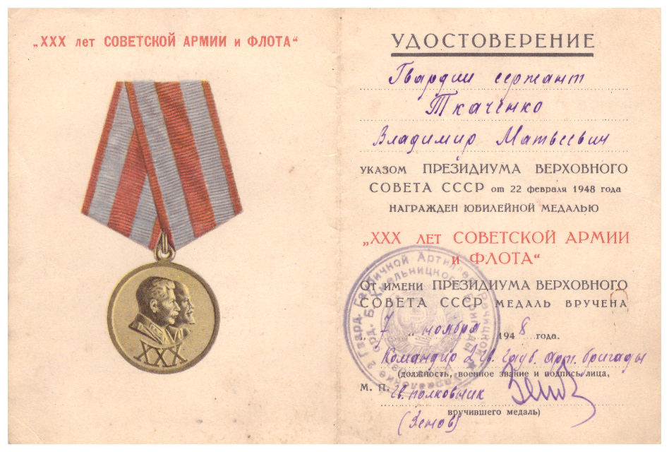 Ткаченко Владимир Матвеевич 1925 жылғы 15 қазанда Наталовка ауылында (Павлов болысы, Кустанай уезінде) дүниеге келген, жеті жылдық мектепті бітірген. 1942 жылдың қазан айында Семиозер аудандық әскери комиссариаты тарапынан әскери қызметке шақырылды. 1942 жылдың қарашасынан 1943 жылдың ақпанына дейін 273 атқыштар полкінде автоматшы қызметін атқарды. 1943 жылдың мамырынан 1945 жылдың қыркүйегіне дейін 1290 гаубица артиллериялық полкінде барлау бөлімінің командирі болды. 1943 жылы тамызда шайқаста ауыр жарақат алды. Соғыс аяқталғаннан кейін 1950 жылдың наурызына дейін 190 гаубица артиллериялық бригадасында қызмет етті. 1950 жылы 31 наурызда демобилизацияланған. Әскери атағы  аға сержант.